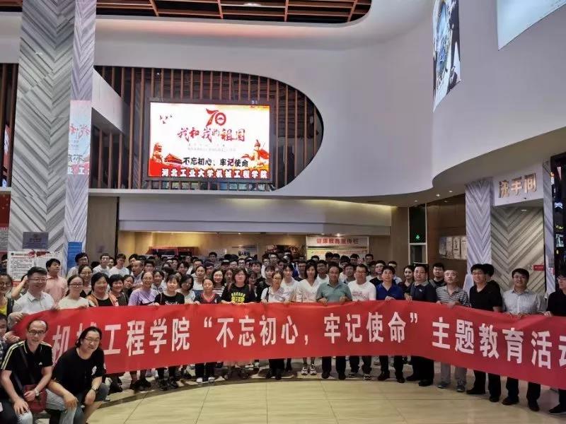 为庆祝中华人民共和国成立70周年,深入开展“不忘初心、牢记使命”主题教育,9月30日下午,机械工程学院党委组织师生党员150余人在北辰区瑞景横店影院集中观看了影片《我和我的祖国》。