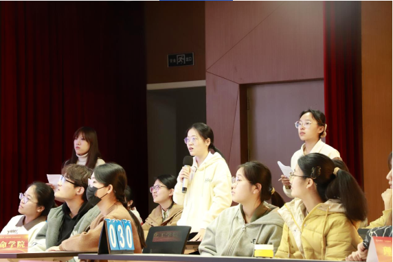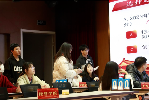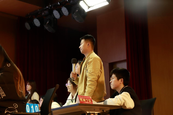 决赛环节,来自人文与法律学院、人工智能与数据科学学院、土木工程与交通学院、经济管理学院、生命科学与健康工程学院、理学院、化工学院、机械工程学院的8组选手,通过必答题、抢答题、风险题、一题决胜等环节进行激烈角逐,现场300余名观众积极参与,气氛热烈。
