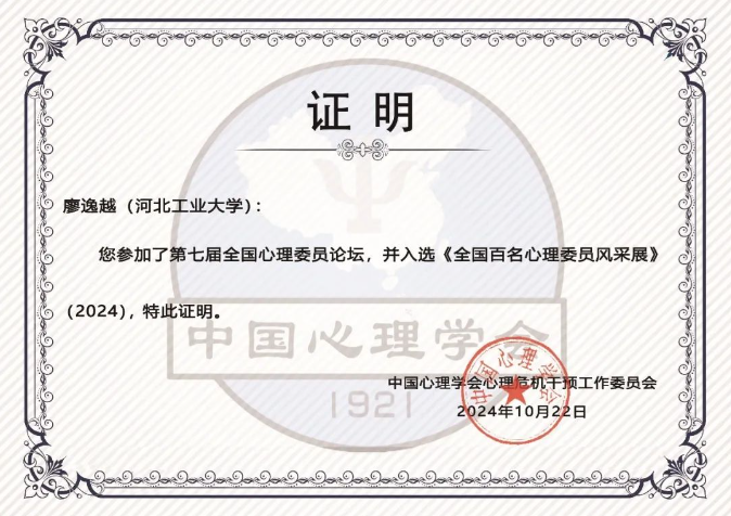 2024年10月,经中国心理学会心理危机干预工作委员会评审,威廉官网中国官方网站廖逸越入选《全国百名心理委员风采展》。