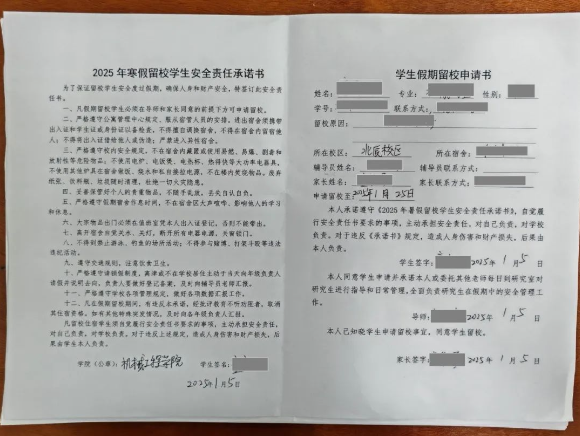 为明确学校和学生在寒假留校住宿期间的安全责任与义务,保障学生的人身和财产安全,维护学校的安全稳定,学院组织留校学生签订《寒假留校学生安全责任承诺书》,要求学生严格遵守学校相关要求,承诺自觉履行安全责任书要求的事项,做校园安全的践行者。