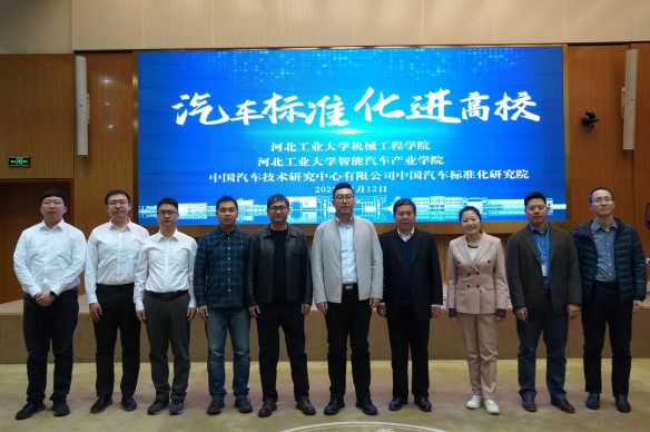 为深入贯彻落实《国家标准化发展纲要》和《标准化人才培养专项行动计划》,深化产教融合、校企协同育人,3月12日16:00,机械工程学院联合中国汽车技术研究中心有限公司标准院,在北辰校区机材楼一楼报告厅举办“汽车标准化进高校”主题活动。中汽研标准院副院长戎辉、本科生院院长张小俊、机械工程学院党委书记杨占力出席活动。活动由机械工程学院党委副书记兼副院长王素丹主持。