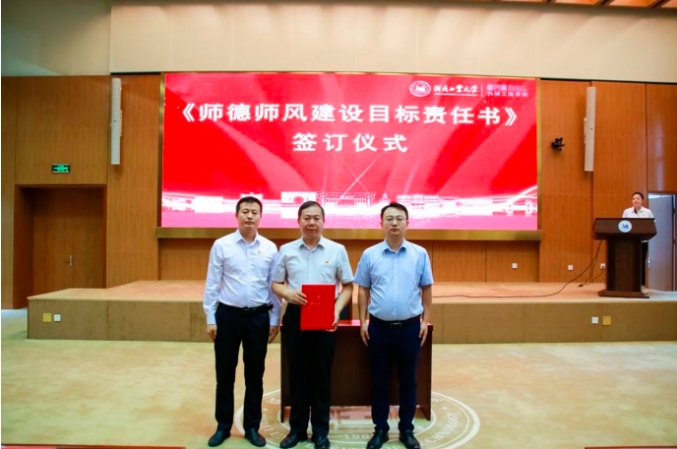 紧接着,召开了机械工程学院全体教职工大会。会上,举行了《师德师风建设目标责任书》签订仪式,由各系党支部书记作为代表签字,全体教职工郑重承诺严格遵守师德规范,不断提升育人水平。随后,各系主任就本学期的工作进行了总结,并对下学期的工作计划进行了详细汇报。