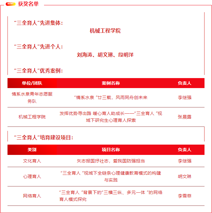 为全面贯彻立德树人根本任务,切实提升新形势下高校思想政治工作质量,调动广大教职员工全员全过程全方位育人的积极性,学校开展“三全育人”先进集体、先进个人、优秀案例和培育建设项目评选活动,机械工程学院积极组织学院教师申报,经学校评审获奖名单如下: