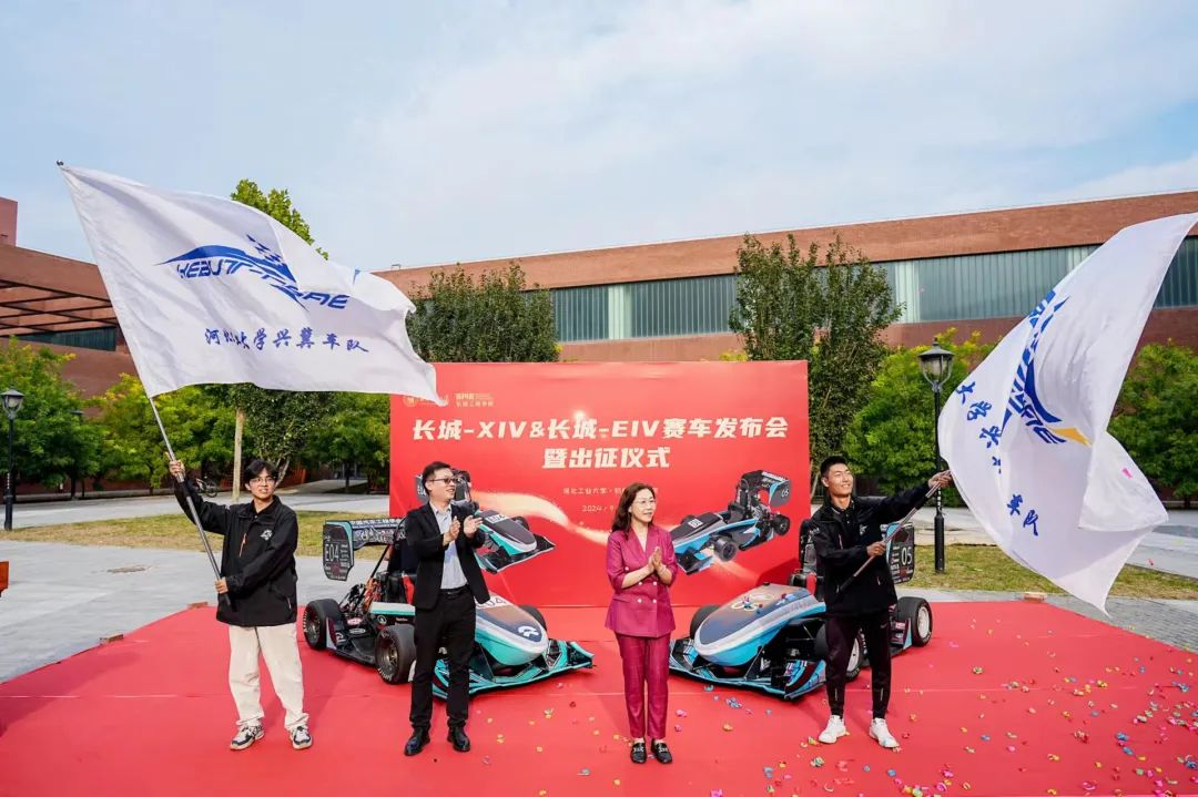 9月25日,河北工业大学大学生方程式赛车新车发布会在河北工业大学北辰校区举行,由该校“兴冀车队”学生自主设计制作的长城-XIV 燃油赛车和长城-EIV 电动赛车全新亮相。河北工业大学党委常委、副校长陈鸿雁与长城汽车股份有限公司招聘总监李明共同为车队新赛季出征授旗。