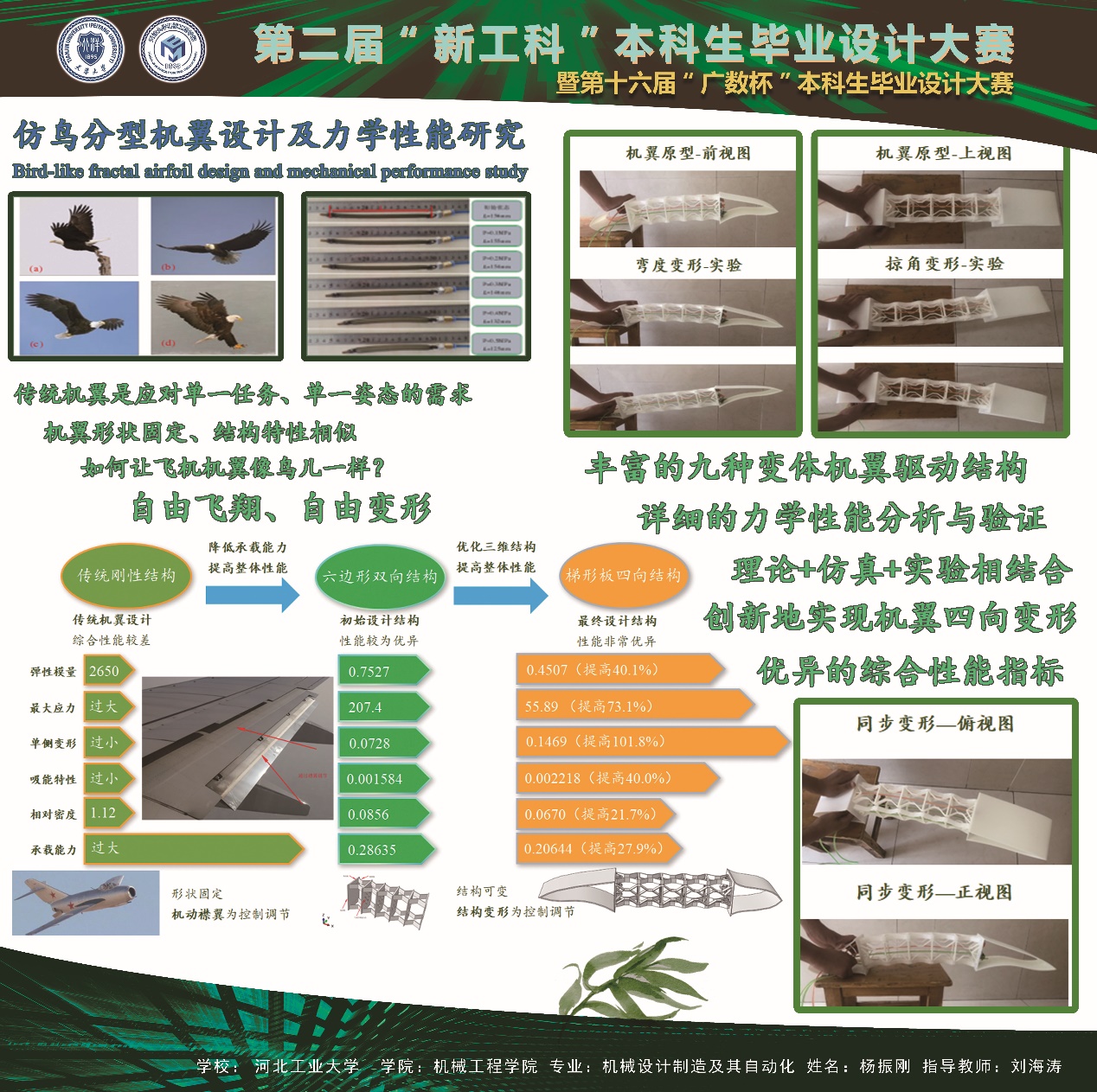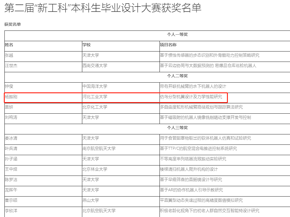 以“交叉融合,智创未来”为主题的第二届“新工科”本科生毕业设计大赛决赛于2022年6月15日在天津大学以线上会议的形式召开。经过答辩和评审,威廉官网中国官方网站机械设计制造及其自动化专业学生杨振刚的本科毕业论文《仿鸟分型机翼设计及力学性能研究》荣获个人项目二等奖。