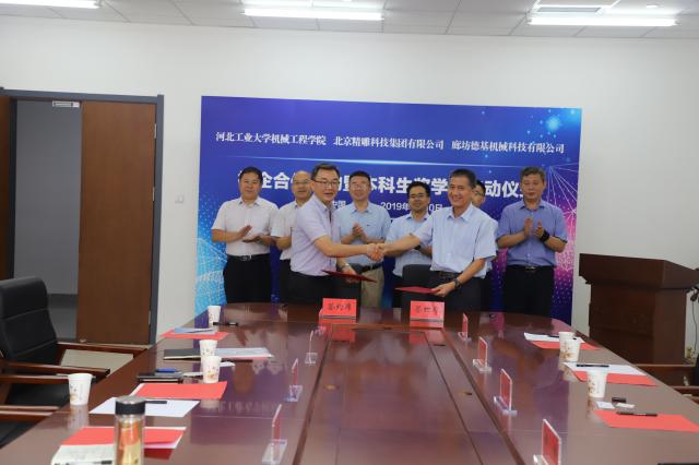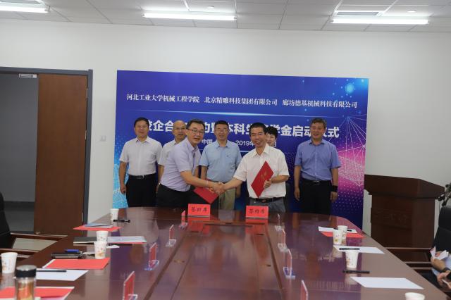2019年7月10日,机械工程学院与北京精雕集团、德基机械校企合作暨本科生奖学金设立签约仪式在机械楼315会议室举行。副校长胡宁、本科生院常务副院长马岱,学院领导王胜利、杨占力、戴士杰、张建军及各系主任、专业负责人;北京精雕集团执行总裁、党委书记吴爱军,北京精雕集团总裁助理李渊志;廊坊德基机械科技有限公司总工程师周伟出席了签约仪式。签约仪式由院党委书记王胜利主持。