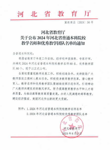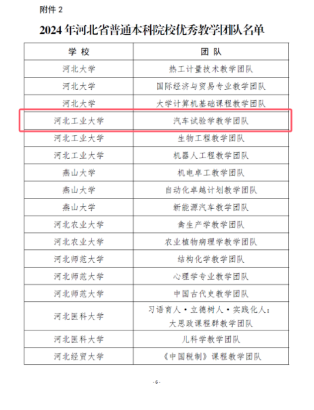 近日,河北省教育厅下发了《关于公布2024年河北省普通本科院校教学名师和教学团队的通知》(冀教高函〔2024〕36号),威廉官网中国官方网站张小俊教授、刘海副教授领衔的“汽车试验学教学团队”喜获“2024年河北省普通本科院校优秀教学团队”荣誉称号。
