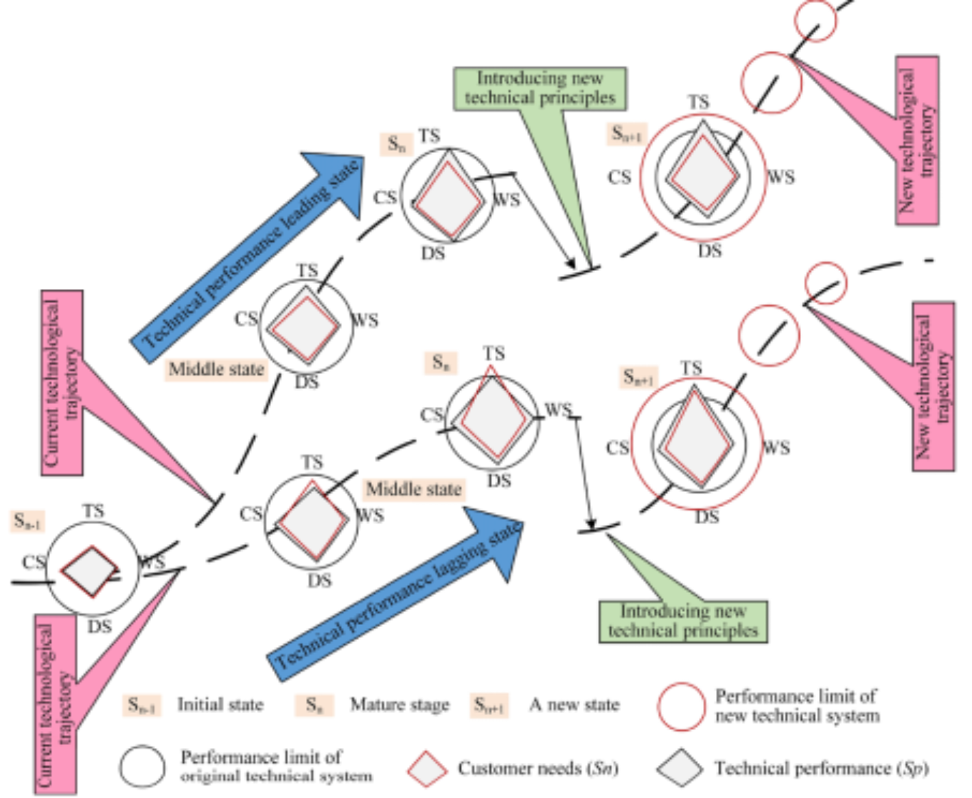 准确识别突破性技术机会是突破性概念成功产生的关键。产品技术系统进化过程中,各子系统间的不均衡发展从事前角度为企业主动实施突破性创新提供了技术机会。鉴于此,研究团队根据突破性创新技术轨道的进化特征,构建了突破性技术机会的识别模型,通过分析所有子系统的技术性能和客户需求间的关系来识别需要进行突破性创新的目标子系统(图2)。